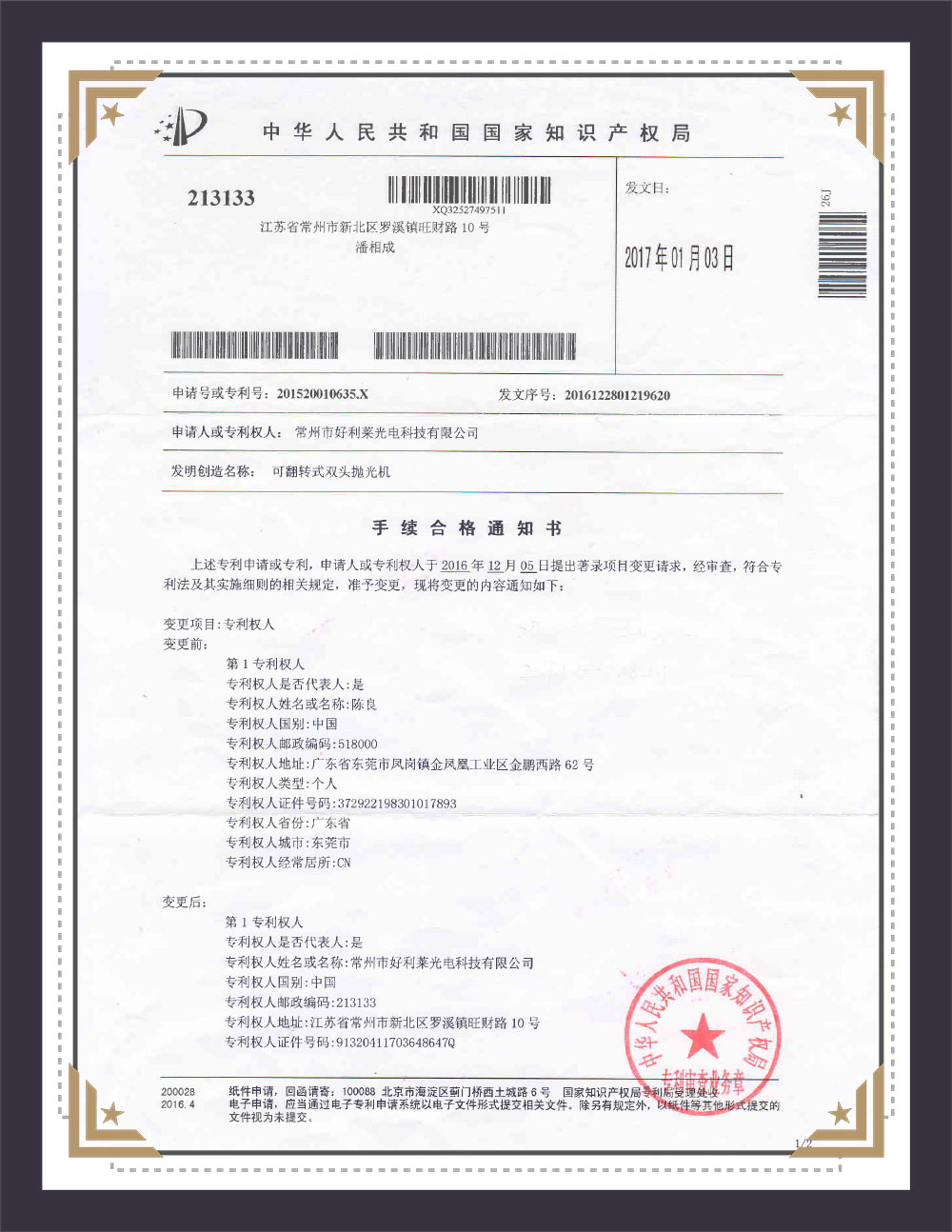 Certificat de brevet du modèle d'utilité